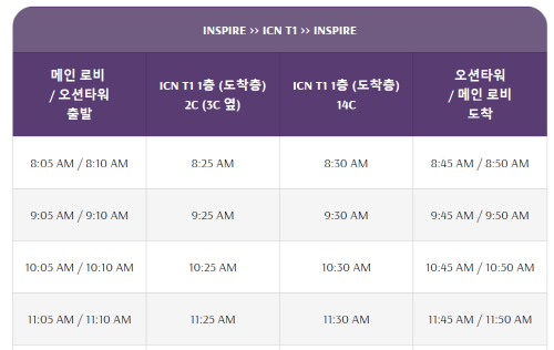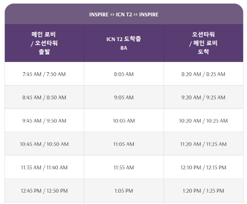콘서트를 많이하는 인스파이어 아레나에서 44인승 무료 셔틀을 운영하고 있으니 탑승 시간을 알고 싶으시면 아래에서 바로 확인 하실 수 있습니다.