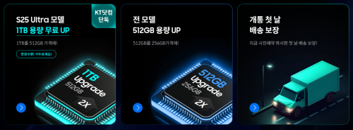 갤럭시 S25는 KT닷컴에서 전 모델 무료 용량 UP! 최대 80만원 할인! KT닷컴 단독 Ultra 모델은 1TB 혜택까지 드립니다!