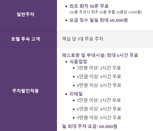 ✔️ 일반 주차: 첫 30분 무료, 이후 30분당 5,000원씩 부과됩니다. 1일 최대 요금은 60,000원입니다.