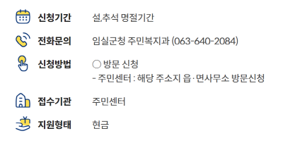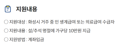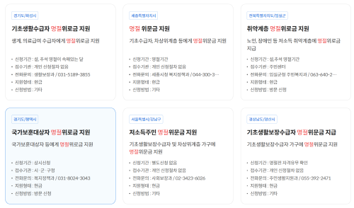 | 구로구 | 기초생계,의료 수급자등대상 설, 추석 명절위문비 지원 | ➡️ 바로가기 |